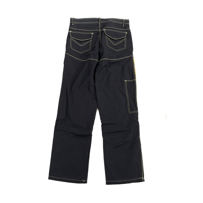 The leather front is layered on top of 100% cotton FR denim to allow for advanced protection without sacrificing comfort. Using a traditional 4-pocket design, the front pockets are protected by a full hook-and-loop closure, while the rear pockets are protected by a snap–over closure to prevent hot material intrusion. A protected button fly completes the fit, allowing for maximum comfort. Adding to the convenience, there is a tool pocket along the right thigh.